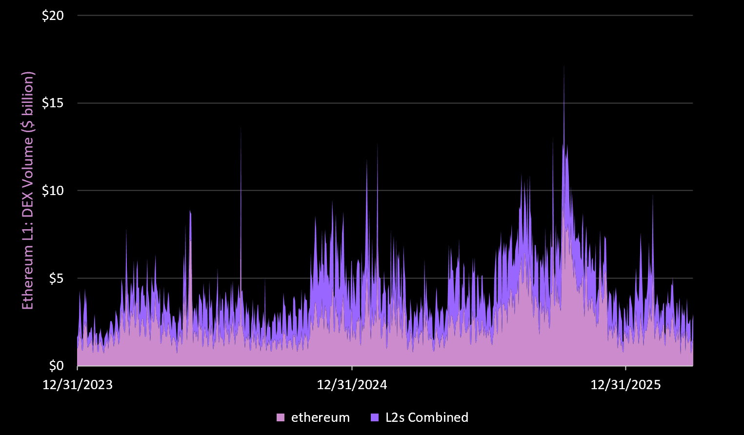 接下来的关键问题是:当 L2 蓬勃发展时,以太坊 L1 是否必须同步实现费用增长?换句话说,即使 L1 的费用捕获未能跟上 L2 的增长步伐,以太坊是否仍能通过 L2 路线图(例如引入传统金融 L2 与传统资产)实现更大成功,并推动整体估值上升?报告后续部分将深入探讨这一议题。