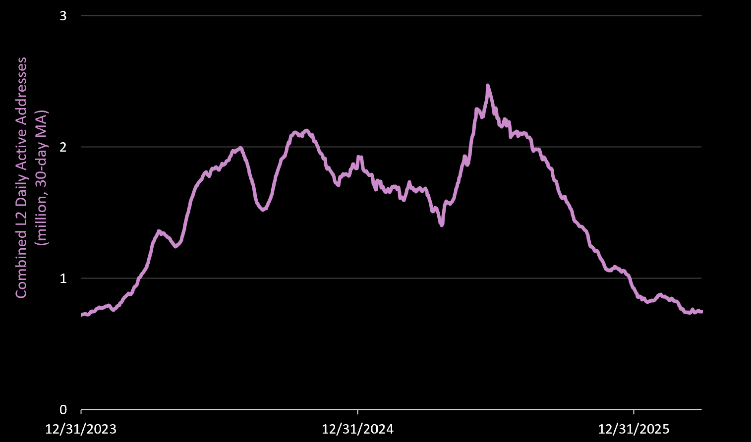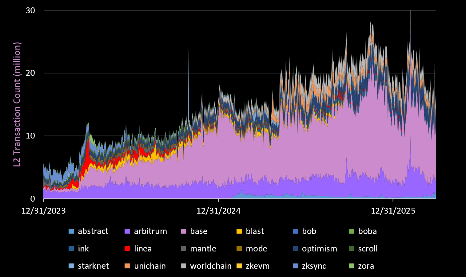 本季度,L2 的日均活跃地址数仅比 L1 高出 12%,远低于上一季度高出 130% 的水平。其中,Base(占 L2 活跃用户的 56%)季度下降 31%。