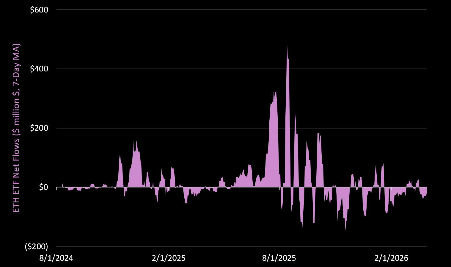 第一季度ETF 净流出 9.78 亿美元,相比去年第四季度14 亿美元的净流出有所收窄。目前,所有 ETF 合计持有以太坊总供应量的 4.7%(上季度为 4.9%)。以太坊 ETF 管理资产规模(ETH 计价)较去年 10 月 8 日峰值下降 17%。作为对比,比特币 ETF 当前管理规模较其峰值仅下降 5.5%。