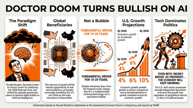 • 诺鲁尔·鲁比尼预测人工智能将推动市场,使未来美国的增长在2030年前达到4%,尽管政治因素存在。