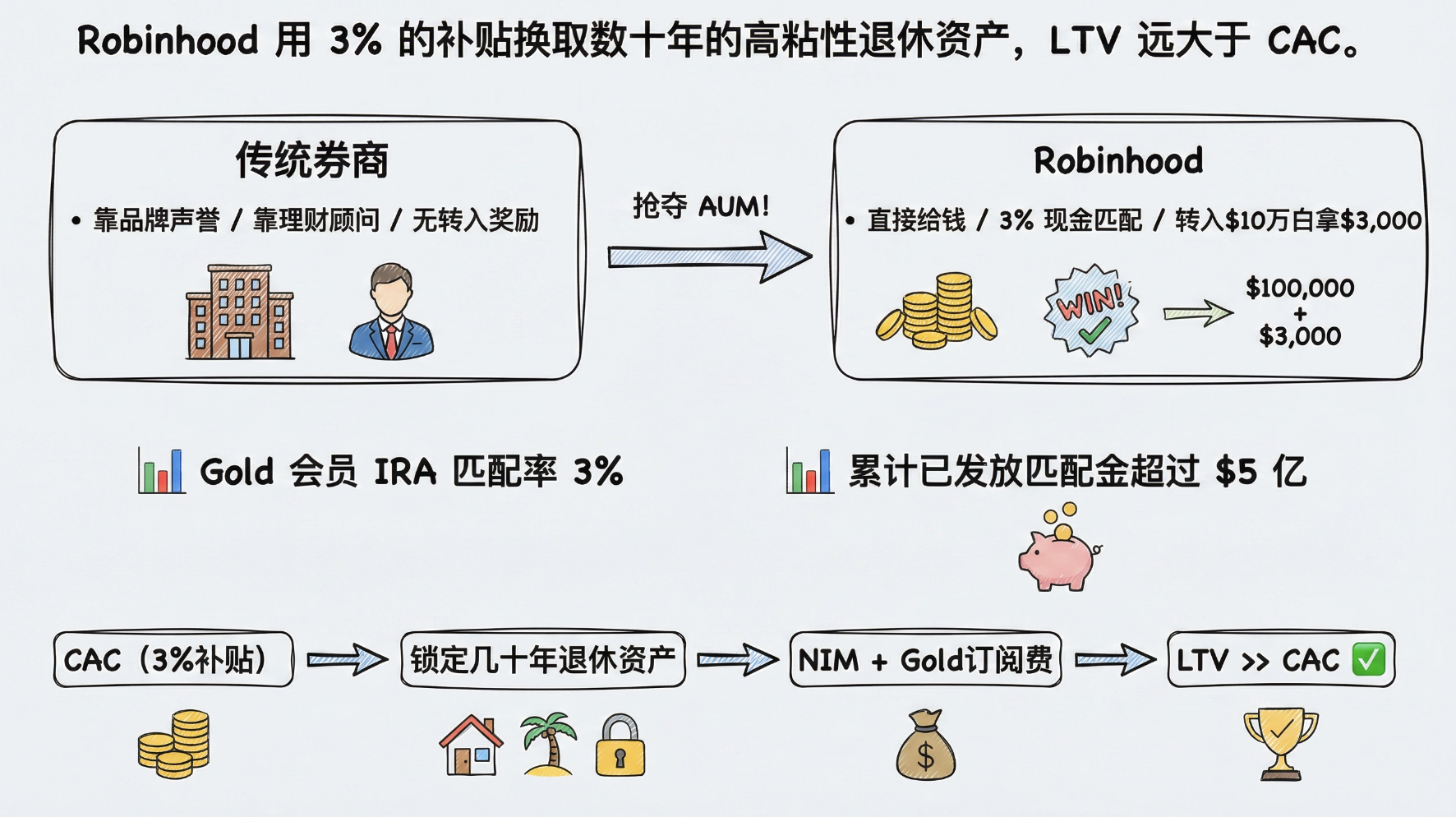 这笔账在经济上是否划算?我们可以从获客成本(CAC)与客户终身价值(LTV)的角度来拆解。截至 2025 年底,客户在退休账户转移和缴款上已累计获得超过 5 亿美元的匹配资金 。这笔支出被 Robinhood 视为获客成本。由于退休账户具有极高的粘性(通常持有几十年),这笔资产不仅能带来长期的净利息收入(NIM)和潜在的投顾费,还能锁定用户成为 Gold 会员(年费 50 美元)。相比于传统券商动辄数百美元且流失率较高的获客成本,Robinhood 用 3% 的补贴换取了数十年的高粘性资产,其 LTV 远大于 CAC。