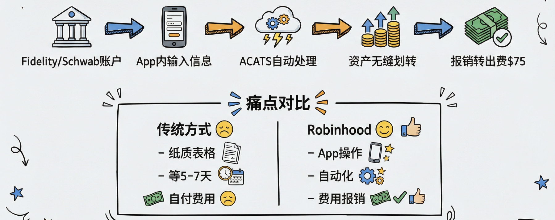 仅仅有补贴是不够的,如果转移过程繁琐,用户依然会望而却步。Robinhood 利用技术手段极大地降低了用户从传统券商转移的门槛。