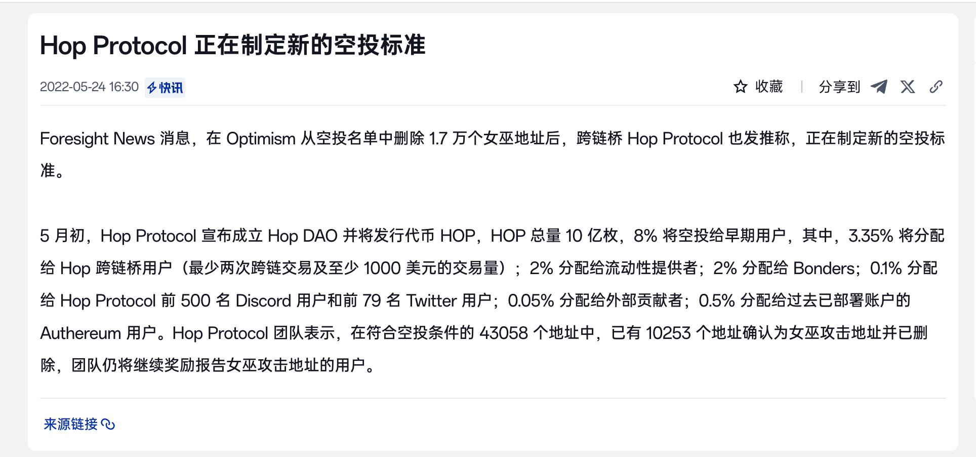 • 反撸过程:跨链桥明星 HOP 首创了令人毛骨悚然的“社区举报女巫(Sybil)”机制。规则极其蛊惑人心:举报者可分走被举报地址的份额。恍惚间还以为几千年前搞连坐告奸的商鞅穿越到了Web3。