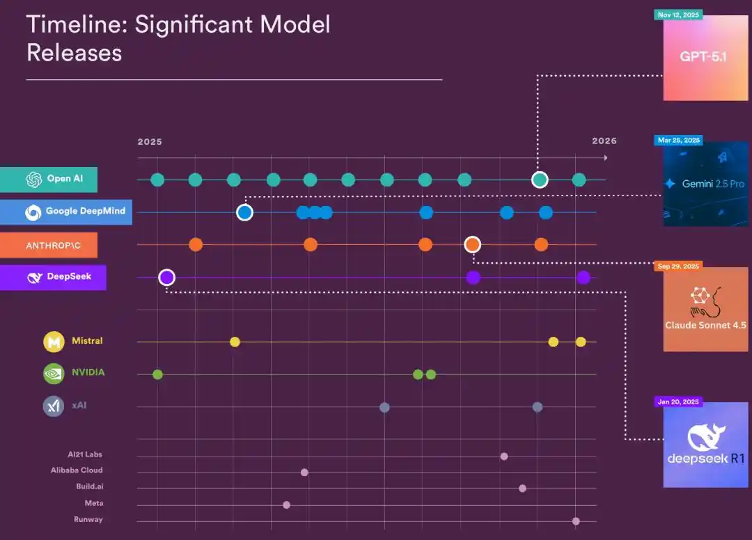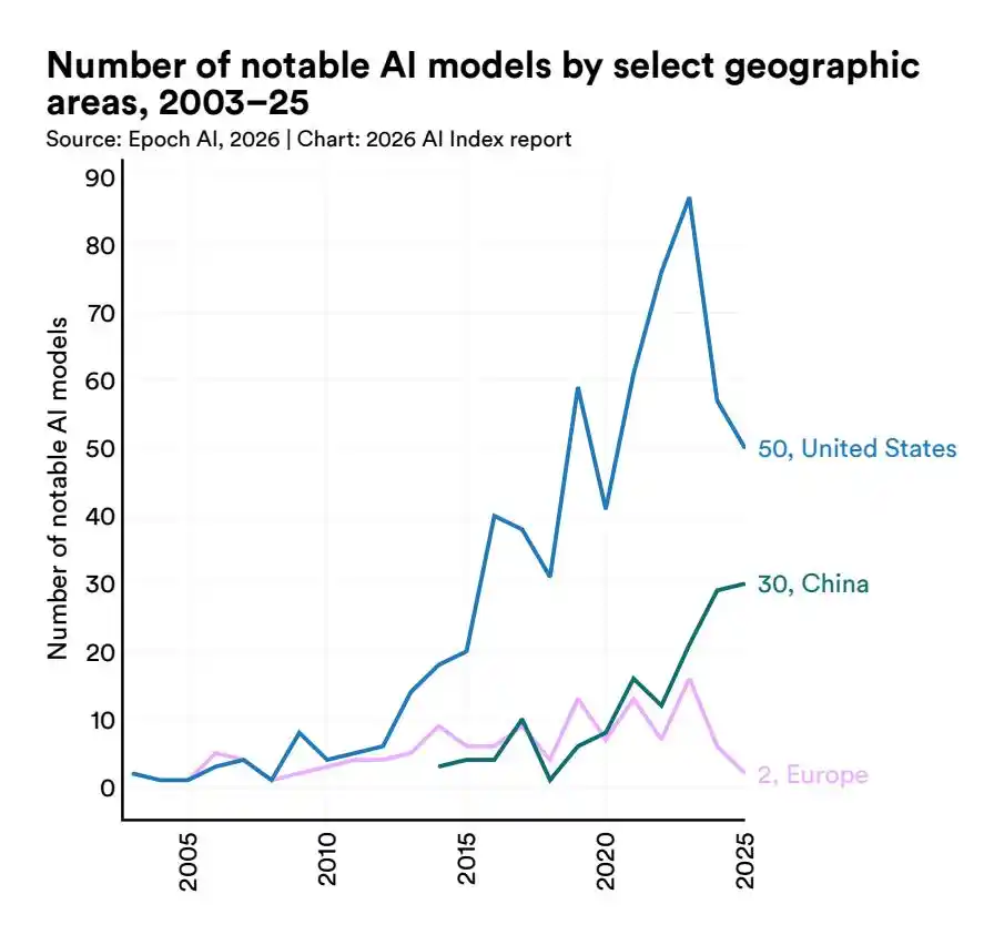 2025 年美国发布了 50 个「显著模型」,中国紧跟着也发布了 30 个顶尖大模型。