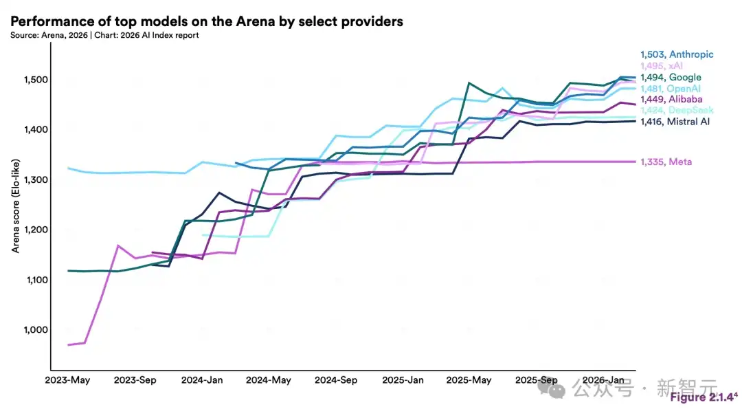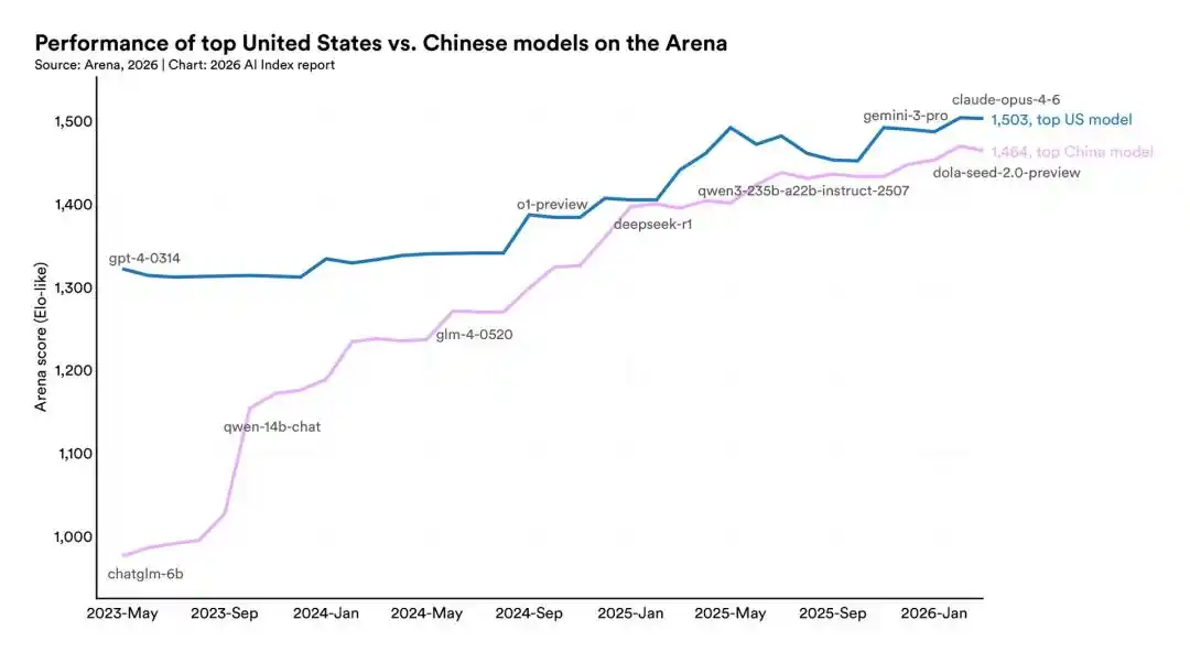 2026 年 3 月,美国的 Claude Opus 4.6 拿到 1503 分,中国 dola-seed-2.0-preview 拿到 1464 分。