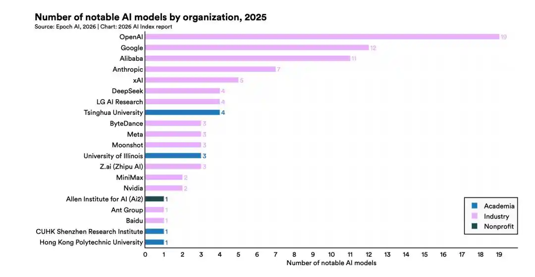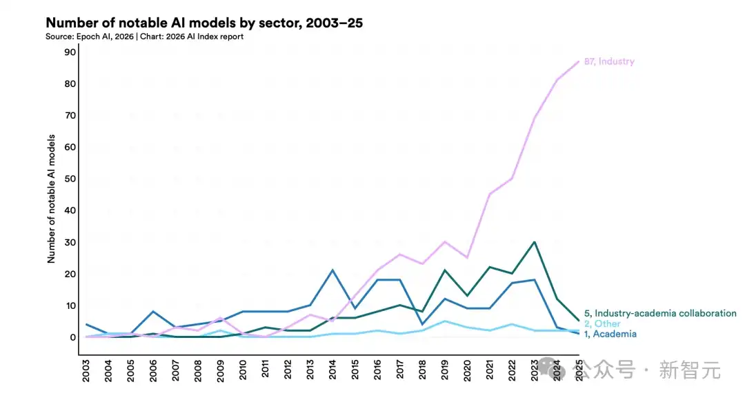 去年发布的 95 个最具代表性的模型里,超过九成都来自产业界,不是学术机构,也不是政府实验室。