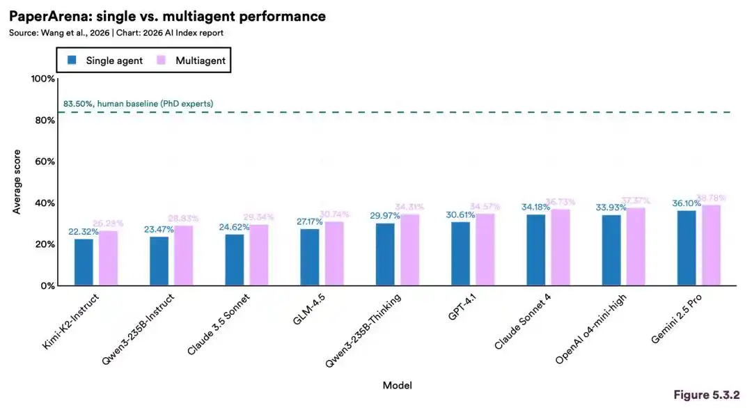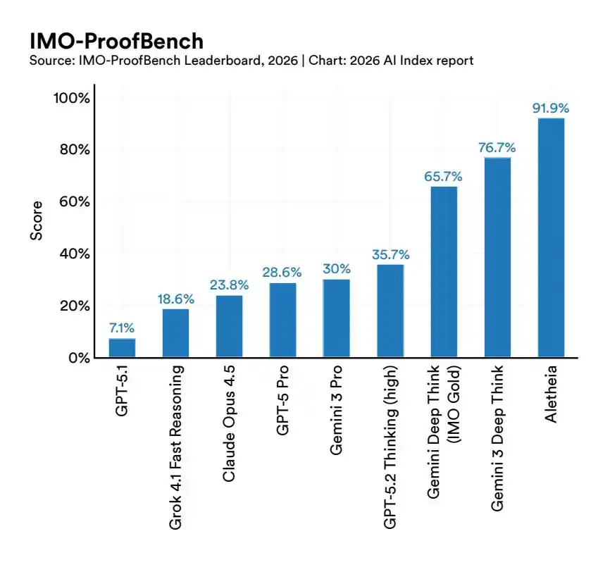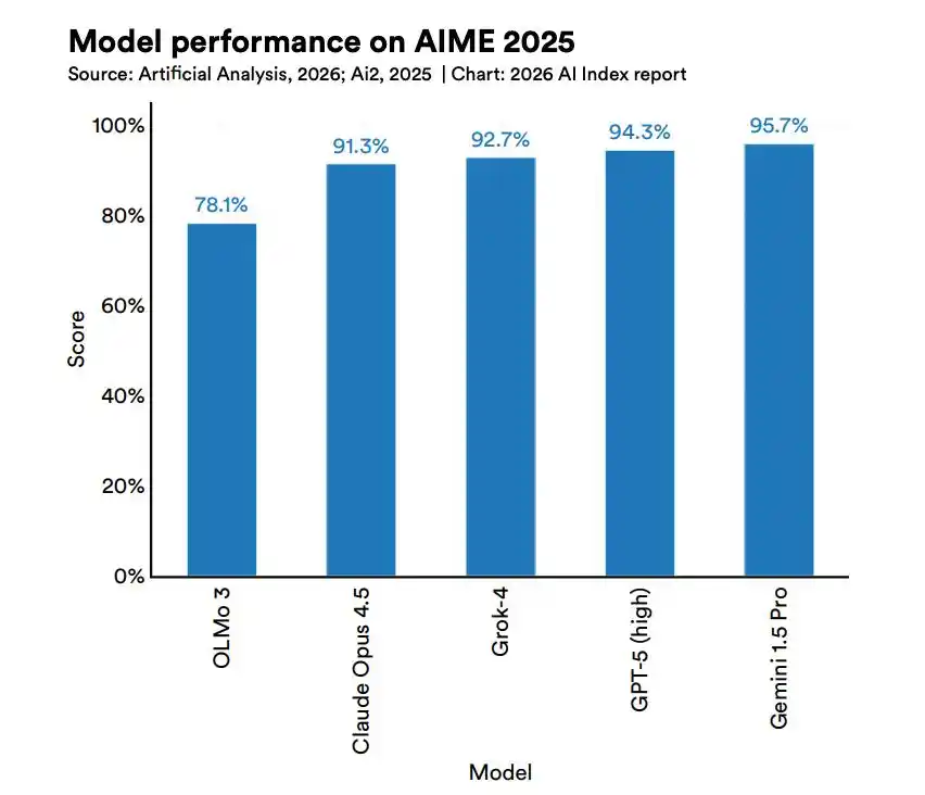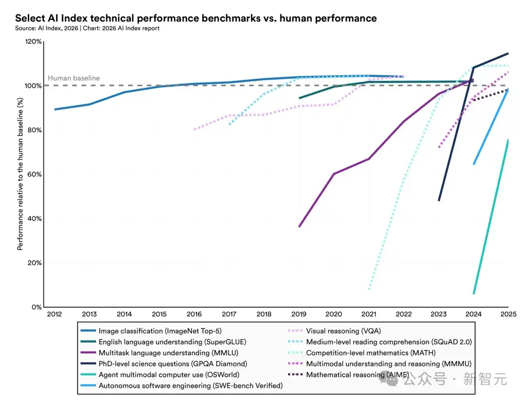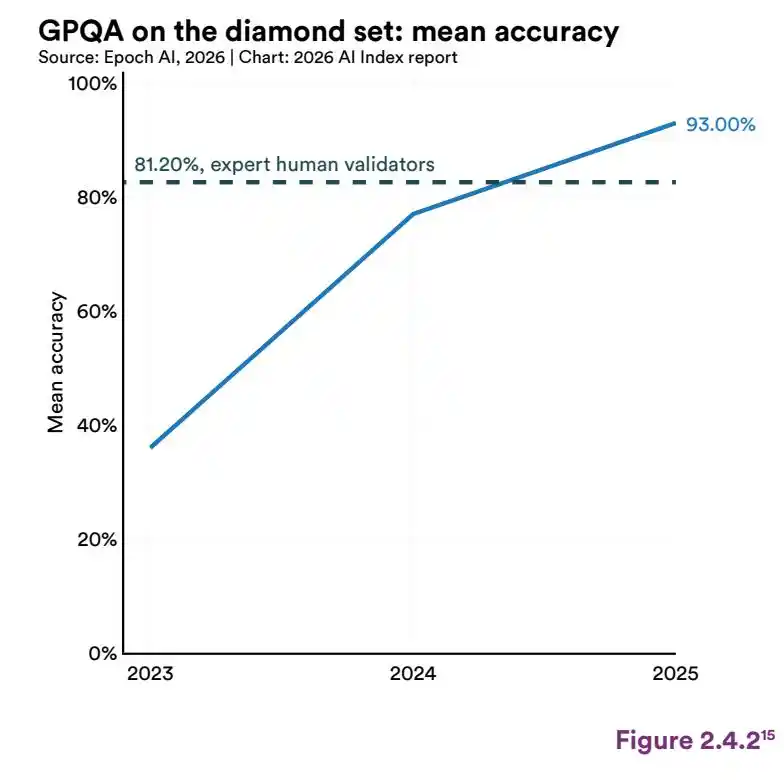 过去一年,全球超 90% 的顶尖模型,在博士级科学问题、多模态推理、竞赛数学上的表现,追平甚至超越了人类。