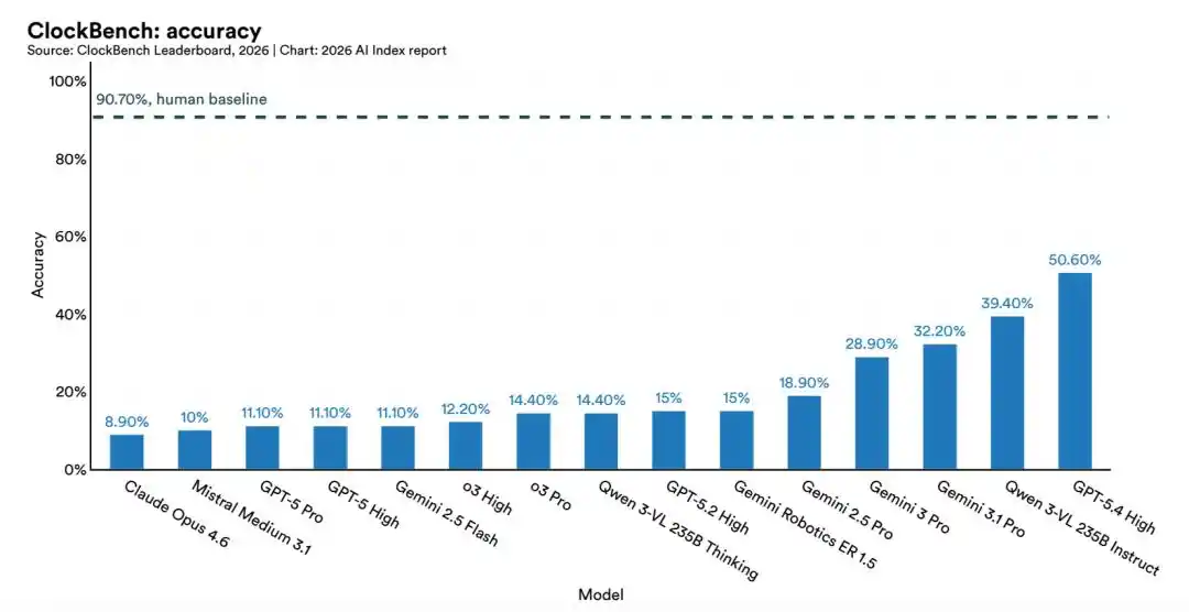 LLM 可以拿下 IMO 金牌,却读不对模拟时钟,正确率仅为 50.1%。