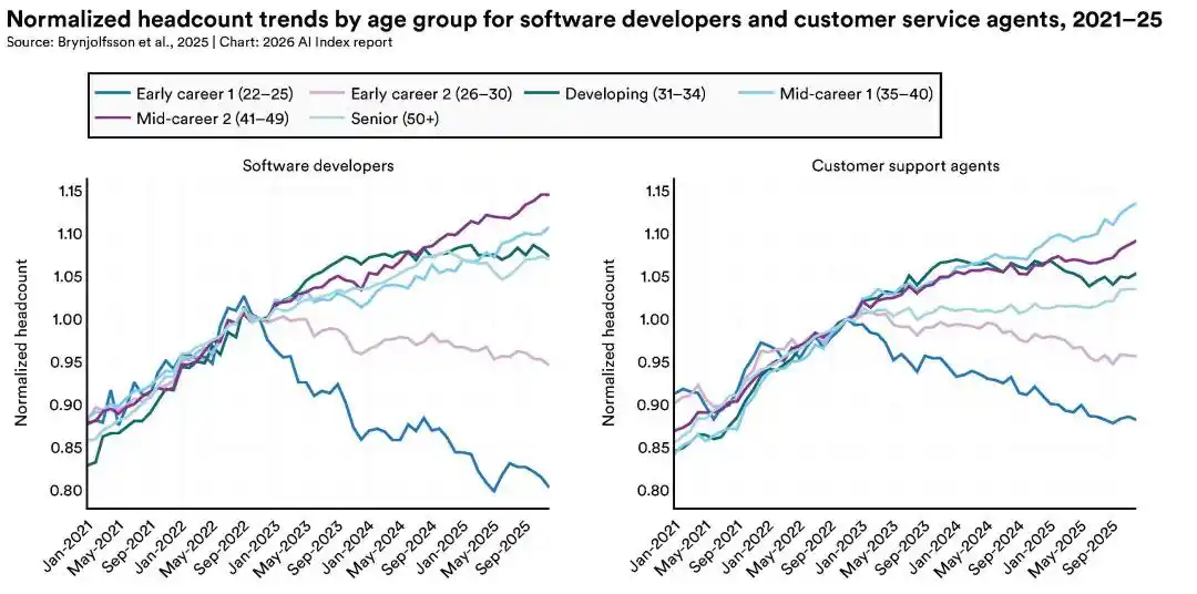 整份 AI Index 里最让中文读者沉默的,可能是关于年轻就业的部分。
