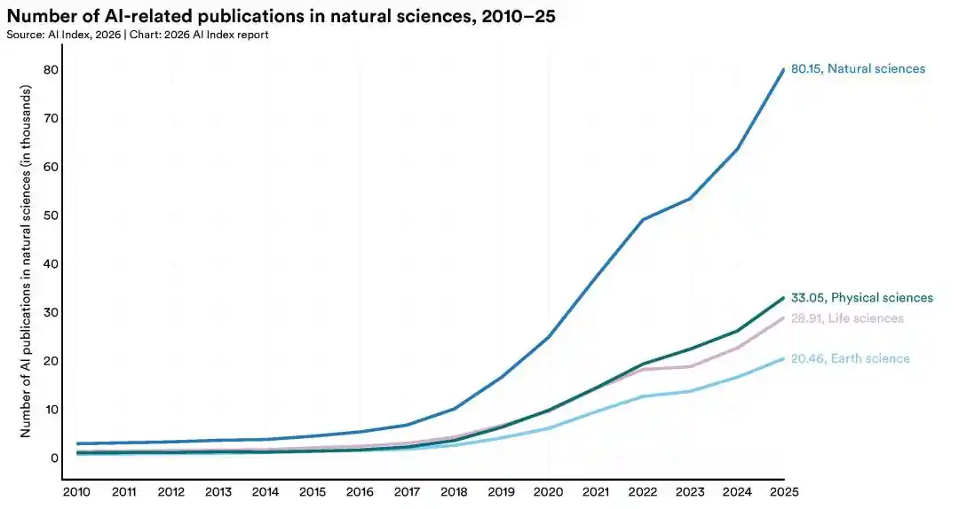 自然科学、物理科学、生命科学领域的 AI 相关论文,2025 年同比增长了 26% 到 28%。