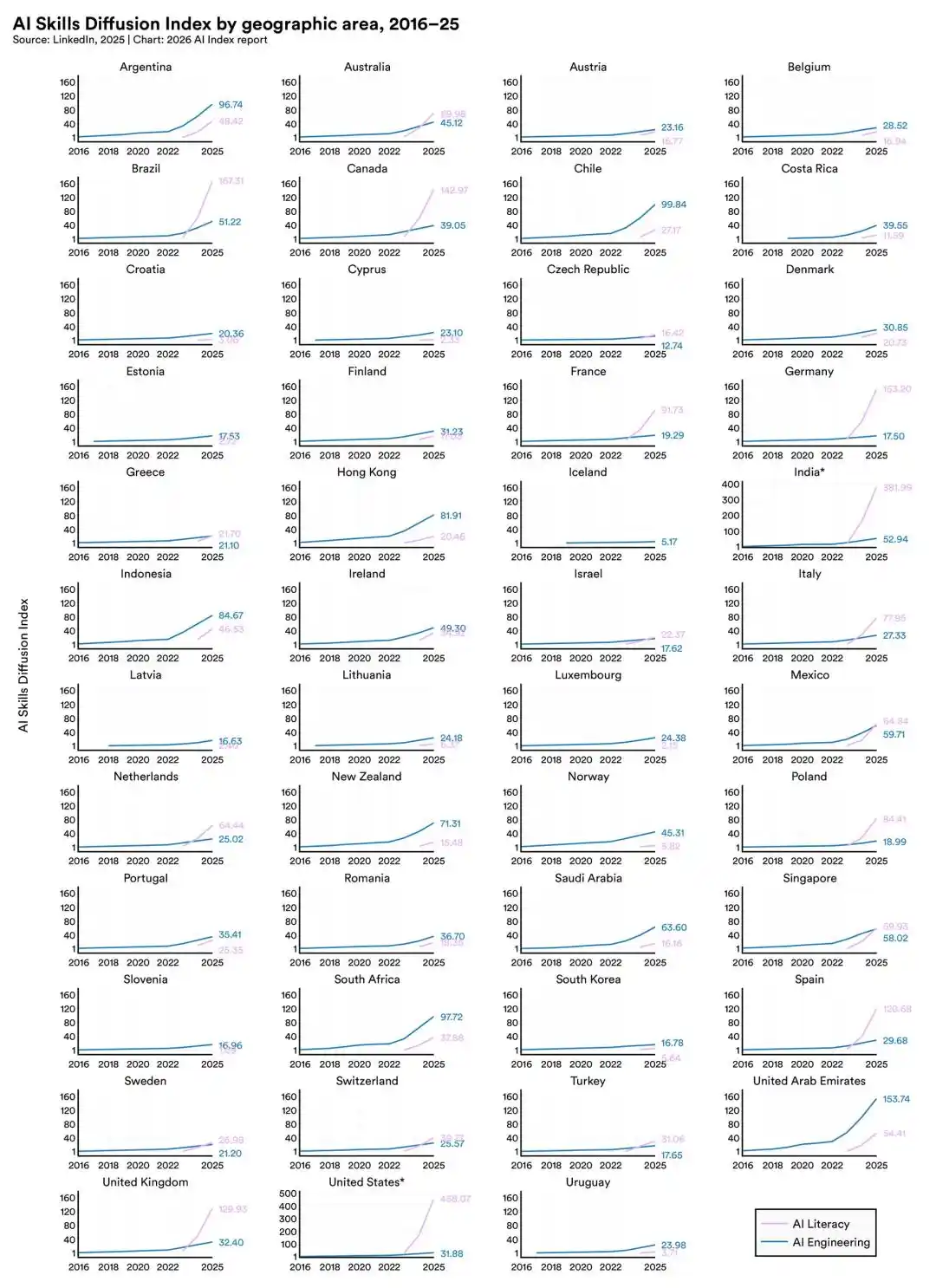 正规教育跟不上的同时,自学浪潮在全球开炸。里面写,学 AI 工程技能增长最快的三个国家分别是阿联酋、智利和南非。