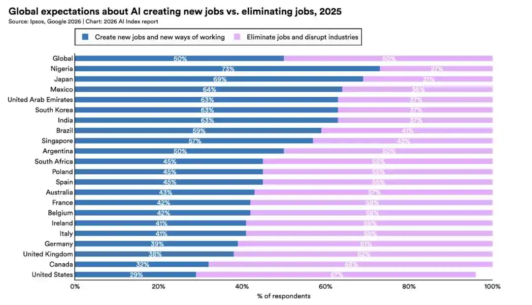 全球范围内,认为 AI 利大于弊的比例从 52% 上升到 59%。但同期,对 AI 感到紧张的比例从 50% 上升到 52%。