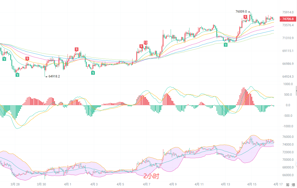 日K线走出了明确的上涨行情,当前成功站上EMA15、EMA30均线,多头趋势初步确立。MACD红柱持续放量,DIF与DEA在零轴上方维持上行,未出现背离信号;布林带开口逐步扩大,价格向布林上轨运行,说明日线级别的上涨动能仍在释放,上方压力看76000-76500,下方支撑看72000附近的布林中轨。
