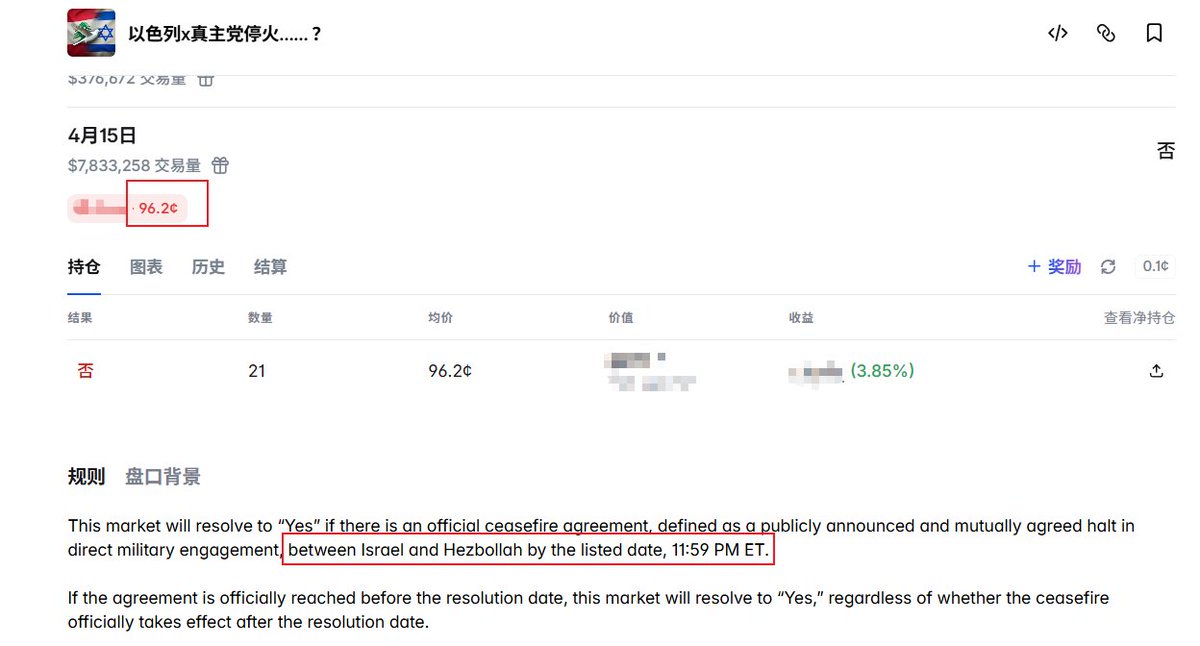 At 9 AM Beijing time on the 16th, I saw the market for the ceasefire between Israel and Hezbollah on April 15, with a probability of No at 96.2%.