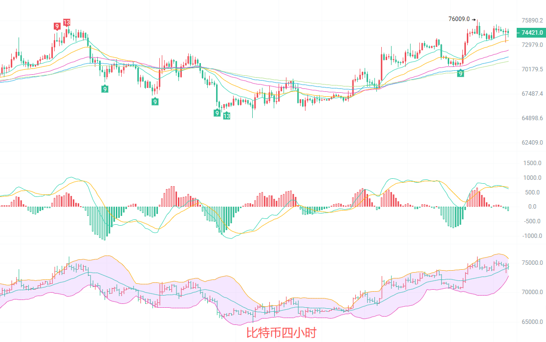 In the four-hour timeframe, the bullish trend is clear, the EMA moving averages are in a bullish arrangement, and the price consistently runs above the middle line of the Bollinger Bands, with the Bollinger Bands opening upwards and a complete ascending channel. The MACD is currently above the zero axis, but the red momentum bars are continuously shrinking, indicating a weakening of bullish force, with a short-term need for correction. The TD indicator shows it is currently at the end of the bullish sequence, and caution is needed for short-term correction to the support level around 74000. If the support holds, an upward continuation is very likely.