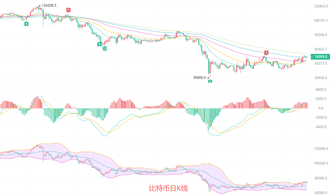 The daily candlestick is in the oscillation and repair phase after a decline, with the current price of 74343 standing above all short-term EMA moving averages. The MACD golden cross is expanding the red momentum continuously, and the Bollinger Bands are opening upwards, with the price running above the middle line, indicating a bullish trend is dominant. The upper Bollinger Band near 76000 is a strong resistance in the short term, while the moving average support near 70000 is quite solid. Overall, the daily trend is biased towards bullish, with limited correction space and a relatively stable upward rhythm.