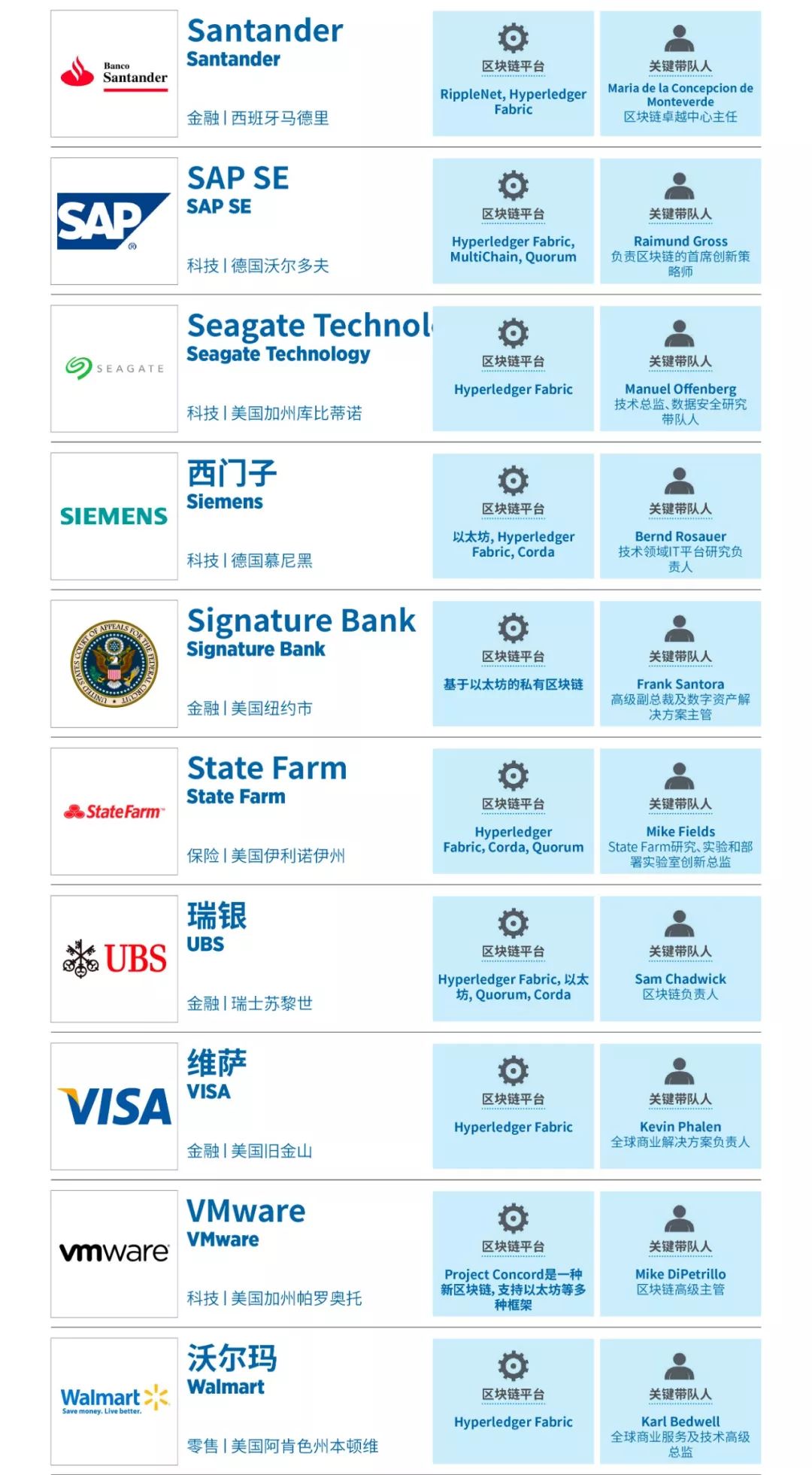 安联、维萨、摩根大通等——主导本榜单的是金融机构,这也是意料之中。但是,区块链50强上榜企业所在的行业多样,有能源公司BP,有零售商沃尔玛,还有媒体公司康卡斯特。我们也能在这份榜单上找到熟悉的中国公司。