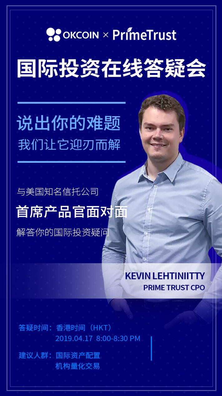 4月17日,据官方消息,OKCoin特别邀请Prime Trust 首席产品官Kevin Lehtiniitty在OKCoin国际站官方Telegram社群进行了主题为“国际投资在线答疑”的用户直播。直播过程中,Kevin Lehtiniitty详细介绍了与OKCoin国际站的合作细节并对全球用户资产配置与投资等问题进行了解答。