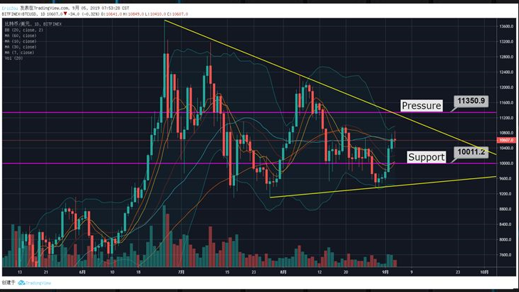 昨日至今BTC冲高回落,最高接近10850美元,目前小幅回撒至10600美元附近。近24小时内,BTC资金净流入金额超过1亿美元,相比上ー周期有所减少。昨日BC日深1040美元近后止映反,今日波晨一度突破10800美元,但上方遇阻并未能继续加速,行情逐渐转向震荡。日内可能暂时以小区间震荡为主,中期趋势方面开始偏向多头,周线级别別的三角震荡已经逐渐接近尾声,后面很可能会有新的行情。上方阻力位继续关注11200美元,下方支撑位留意10400美元附近。操作方面,日内若回踩靠近支撑位可以逐步建仓。
