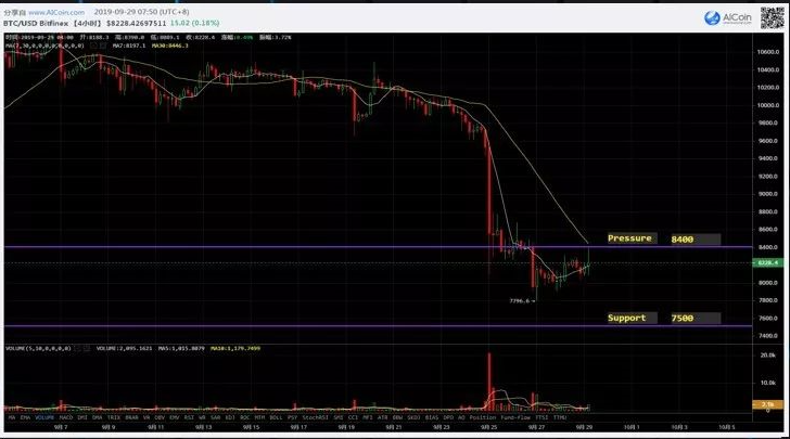 昨日至今BTC继续震荡,目前仍在8200美元附近徘徊。近24小时内,BTC资金净流入金额超过3000万美元,市场入资金量小幅增加。BTC近日凌晨再度向上试探8400美元阻力未果,现已回撤到8200美元附近。4小时线来看,BTC反弹量能渐弱,短期很难有足够的力量向上突破,有可能会出现进一步回调。下方支撑位首先关注8000美元关口,跌破该支撑后则需留意7500美元附近。操作方面,背靠8400美元可以考虑部署适量空单,现货方面暂时不盲目操作,仓位较重的建议減仓至50%以下等待更合适的入场机会。