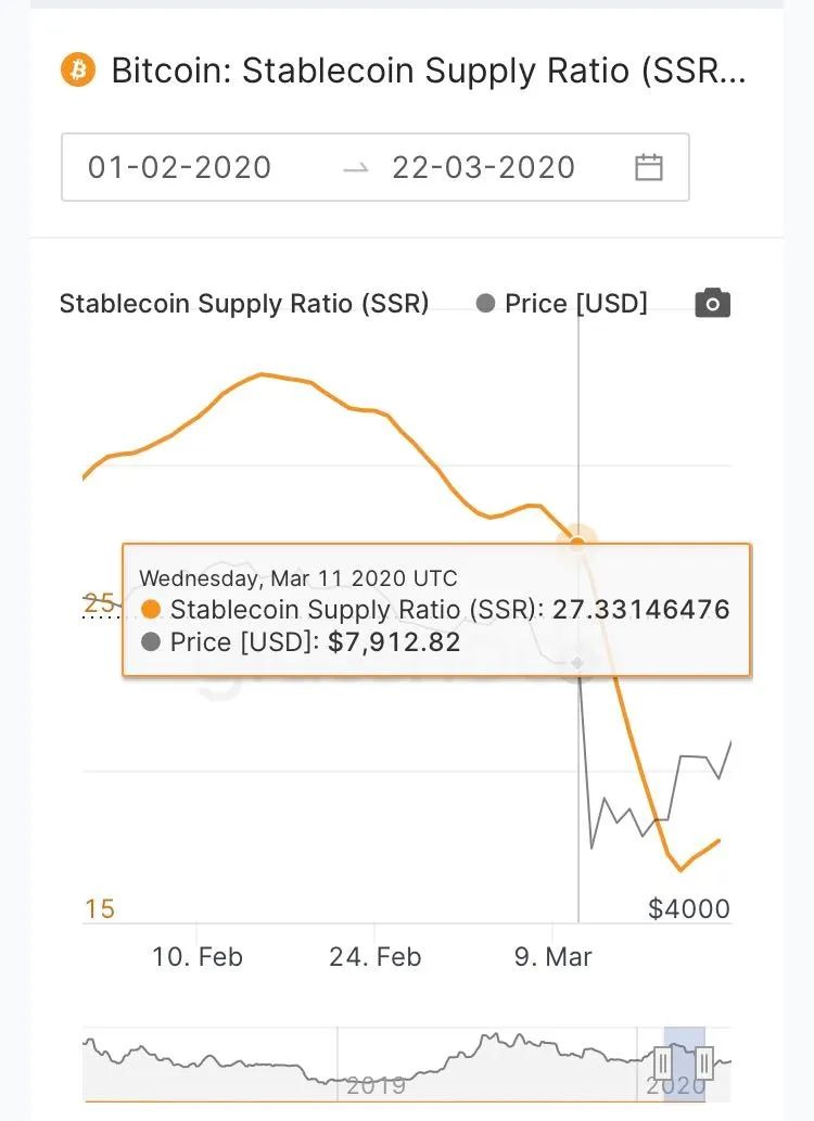 众所周知,3月12日至13日,加密市场杠杆崩坏,大幅洗盘的同时,包括USDT在内的稳定币大量增发。glassnode图表数据显示,UTC时间3月11日开始,SSR指标出现和比特币价格同步下滑的情况。