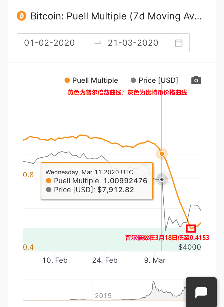 3月12日至13日,比特币暴跌引起市场恐慌的同时,比特币链上有一个数据——Puell Multiple(普尔倍数)达到了历史低点。
