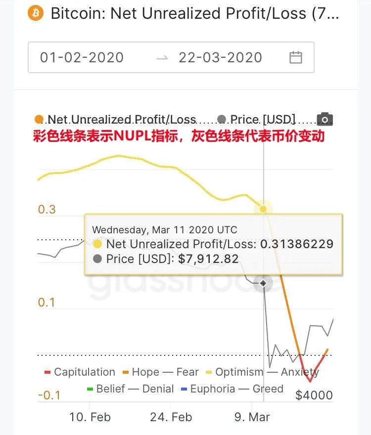 我们也可以看到,NUPL曲线在不同数值区间呈现出不同的颜色,分别对应不同的投资者情绪——投降、希望、恐慌、乐观、不安、信仰、拒绝、兴奋、贪婪。因此,NUPL是一个很好的判断市场情绪的指标。