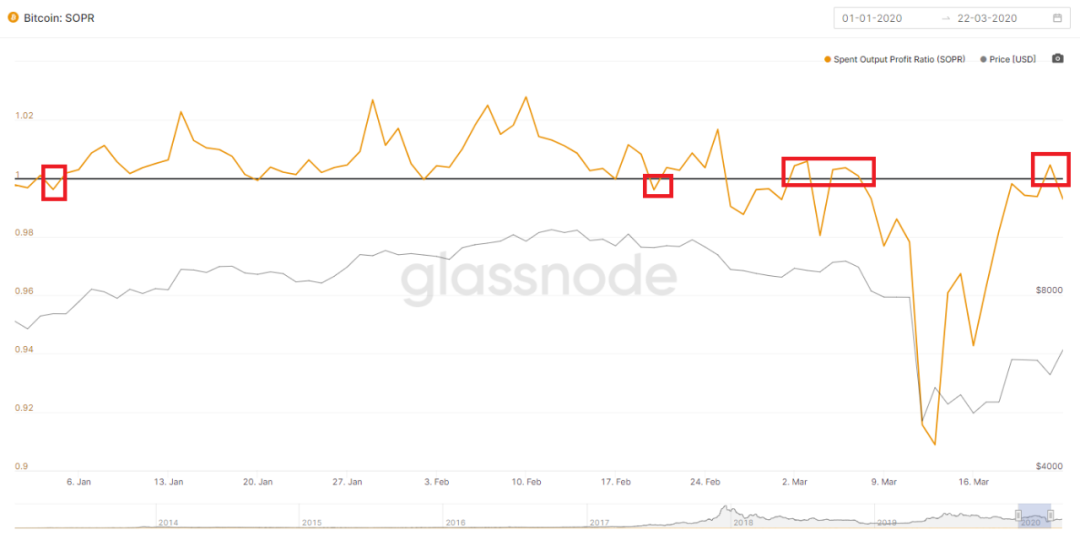 3月12日开启的币价黑天鹅事件中,不少投资者割肉止损,导致比特币全网在那两天呈现出亏损状态,这表现在SOPR指标上,即SOPR数值徘徊在1以下区间。