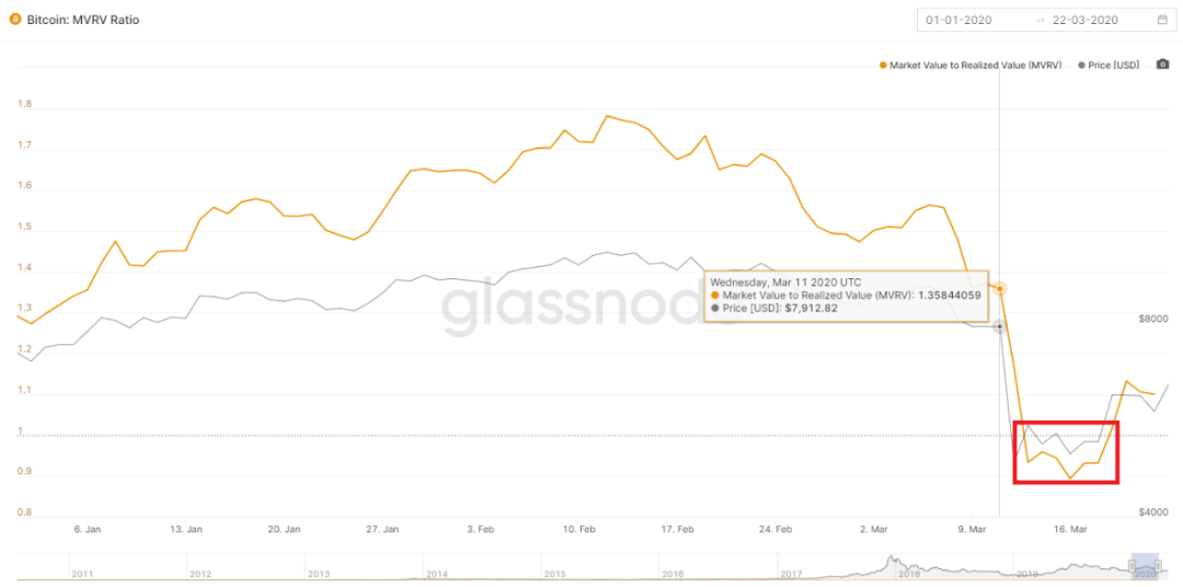 因此,MVRV是一个比较好的用于判断市场处于顶部还是底部的指标。MVRV峰值通常表示市场处于顶部,而MVRV低谷则表示市场处于底部或者积累期。 glassnode数据显示,最近一次MVRV数值降到1以下(也就是市场处于低估比特币价值时期)是在3月13日至3月18日,当时币价处于5500以下区间。
