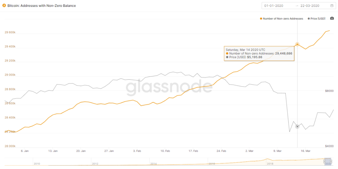 在3月12日币价异变后的几天,glassnode数据显示比特币非零余额地址数量有所下滑,但是很快,曲线又延续了此前的上升态势。由此可见,全网比特币持币用户数量基本上呈现增长趋势,比特币网络正在容纳越来越多的用户。