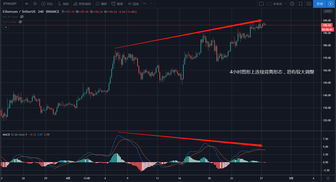ETH:反弹幅度偏大,4小时图形上已经形成连续的顶背离形态,近期应注意较大幅度的调整风险,合约上可逢高布局空单。支撑位:185美元,压力位:205美元。