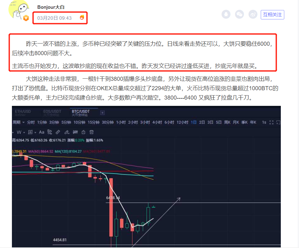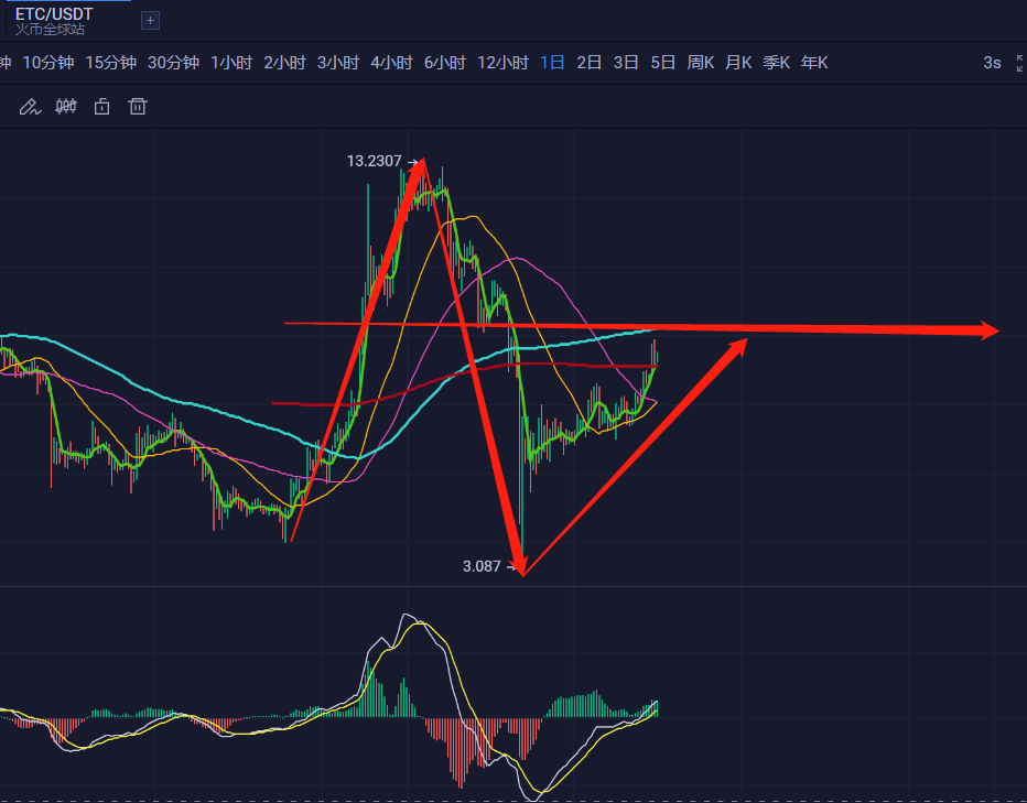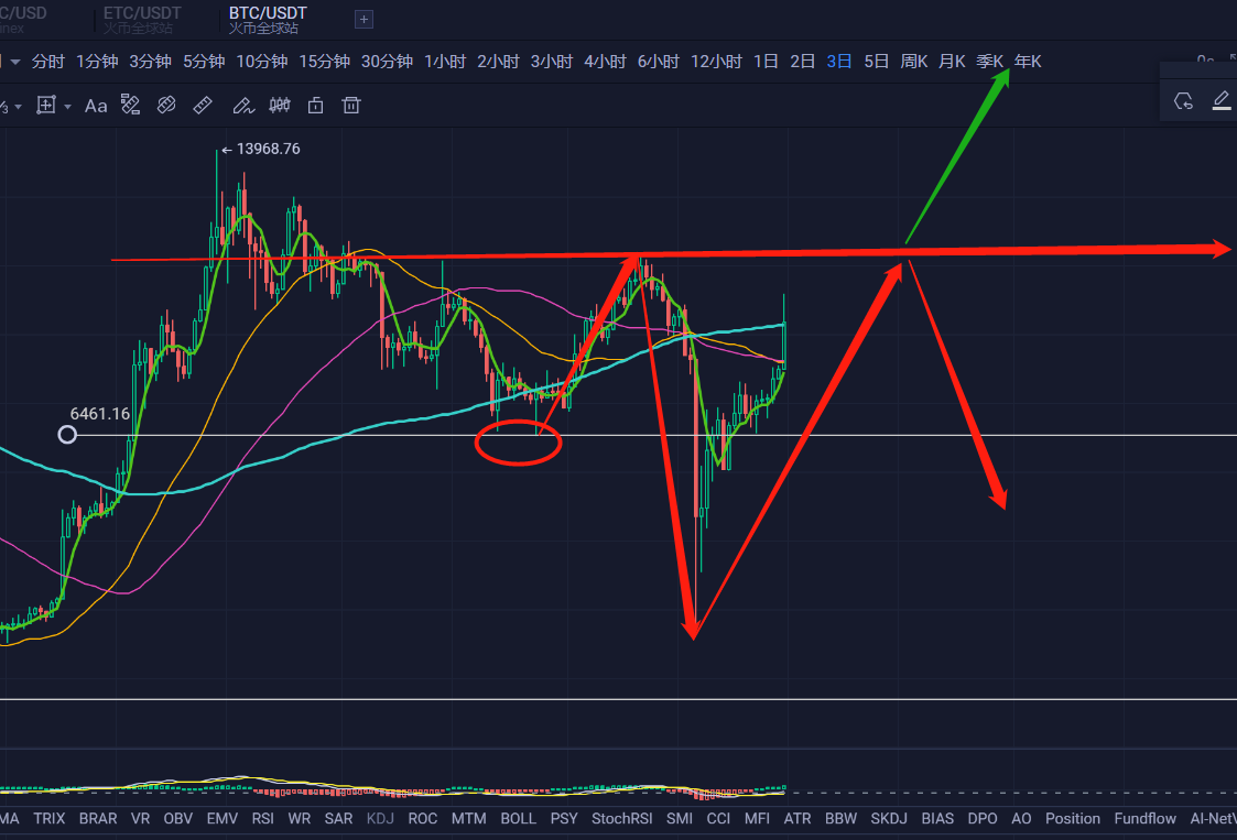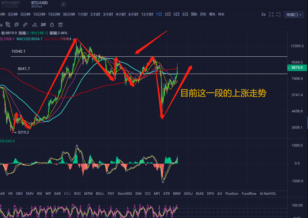 目前行情走到现在其实又到了上方压力位区间,是不是大牛市还得看能不能突破10500这个高点。只有突破了这里才能挑战2万美元的关口,创造出比特币价格历史新高。