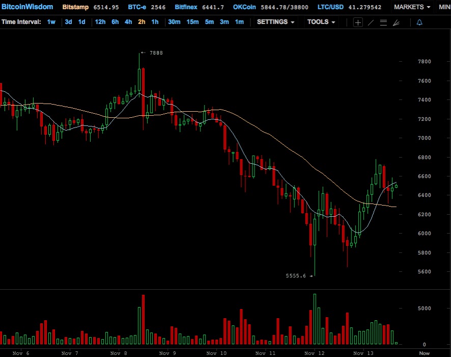 华尔街见闻早些文章显示,11月比特币上演了过山车行情。在芝商所10月31日宣布推出比特币期货后,比特币连破纪录,在11月8日刷破新高至7888美元。不过比特币却在上周五一路俯冲,价格一度从11月8日的7888美元下挫到周日的5555.6美元,跌幅达30%。据Bitstamp数据显示,今日比特币较周日的两周半低位大幅反弹1000美元,12个小时涨幅达15%。比特币现在交投于6500美元附近。