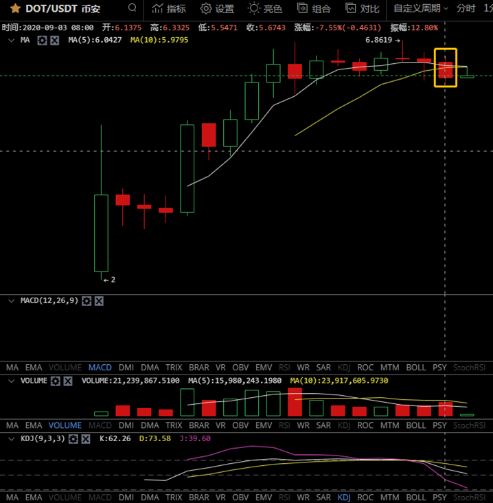 撰文时,DOT即时价格5.73刀,昨日日线收出小阴线,日线跌破了短期的5日和10日均线,相比较而言,DOT还是比较抗跌的,因为昨天主流币都出现了很大跌幅。在大盘不稳的情况下,DOT阶段性顶部也是一系列滞胀信号,继续观察市场对DOT解锁代币的消化情况。