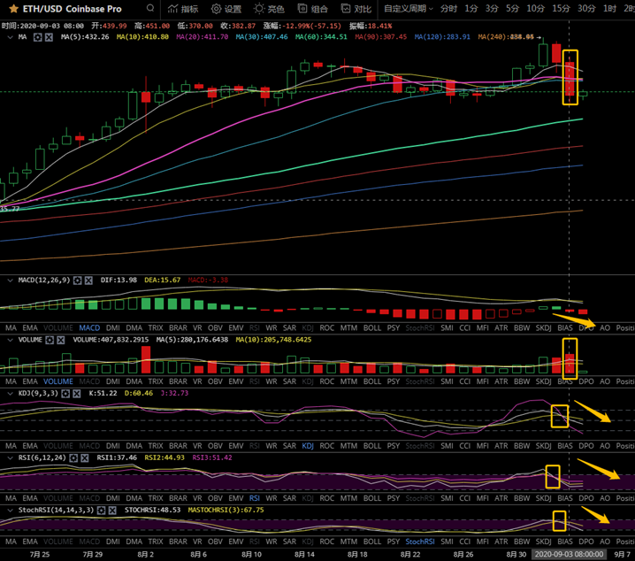 撰文时,ETH即时价格389.5刀,ETH昨日的日K线收出实体超过13%跌幅的大阴线,日线跌破了20日,30日均线位置,但是在370刀的前期整理平台止跌了,以太在360刀的阶段性前高平台的支撑位还是非常强。
