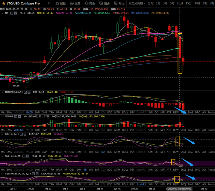 撰文时,LTC即时价格48.8刀,LTC昨天的日线收出一根阴线实体跌幅达14%的超级大阴线,下影线一度打到了45.1刀的位置,日线收盘价位于90日均线下方,LTC的洗盘是进行得非常非常彻底。MACD能量柱在负轴继续下行,KDJ随机指标也在死叉后向下,震荡指标的信号是向下的