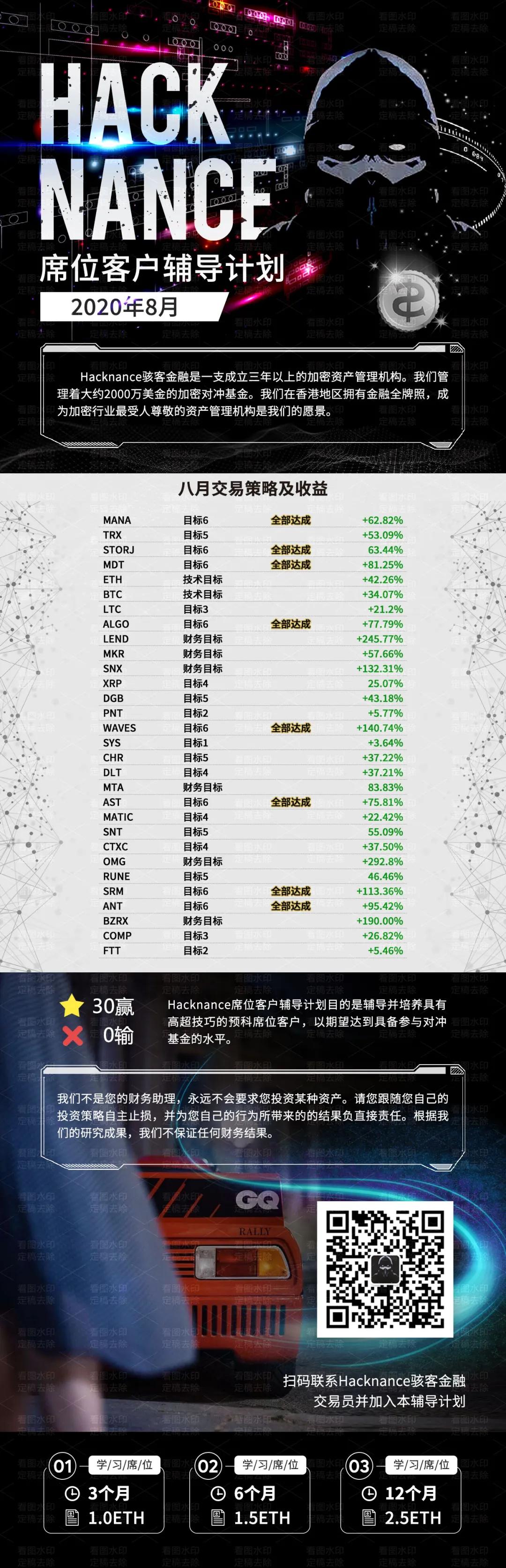 Hacknance为了辅导更多的投资者成为专业、稳定、持续成长的席位投资者,并加入加密对冲基金战略合作者的大家庭中来,近期开启了“Hacknance骇客金融机构席位客户辅导计划”,并在微信群进行了VIP名额抽奖活动,也得到了大家的认可和支持,给大家分享一下我们八月份的交易策略和收益总结: