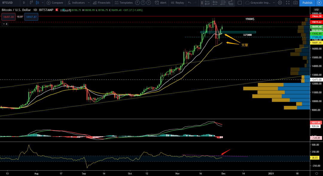 价格重新站上通道的中轴,关键的支撑如图中箭头所示;