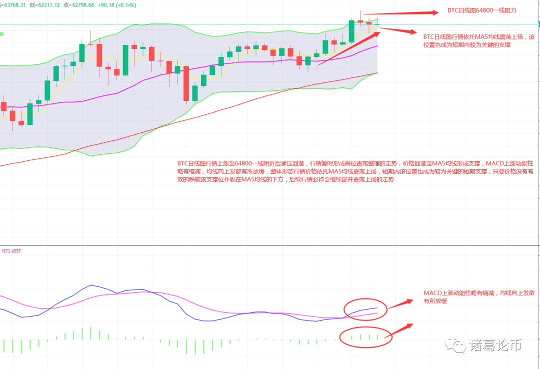 BTC行情承压回落至61300一线附近后逐步企稳反弹上涨,今日早间价格上涨至63800一线附近小幅承压调整,行情暂时形成高位震荡整理的走势,技术形态行情价格回落日线MA5均线形成支撑反弹,该位置也将成为短期内较为关键的支撑点位,MACD均线向上发散有所放缓,上涨动能柱略有缩减,短期内行情还有一定小幅回落的可能,整体形态行情依托着MA5均线形成震荡上扬的走势,只要行情价格在收盘时段未能形成有效跌破MA5均线支撑,且价格收在MA5均线下方的形态,那么行情在震荡整理之后必将会再度启动强势上涨的走势,所以日内需关注行情价格回落调整后企稳介入抄底的时机出现。