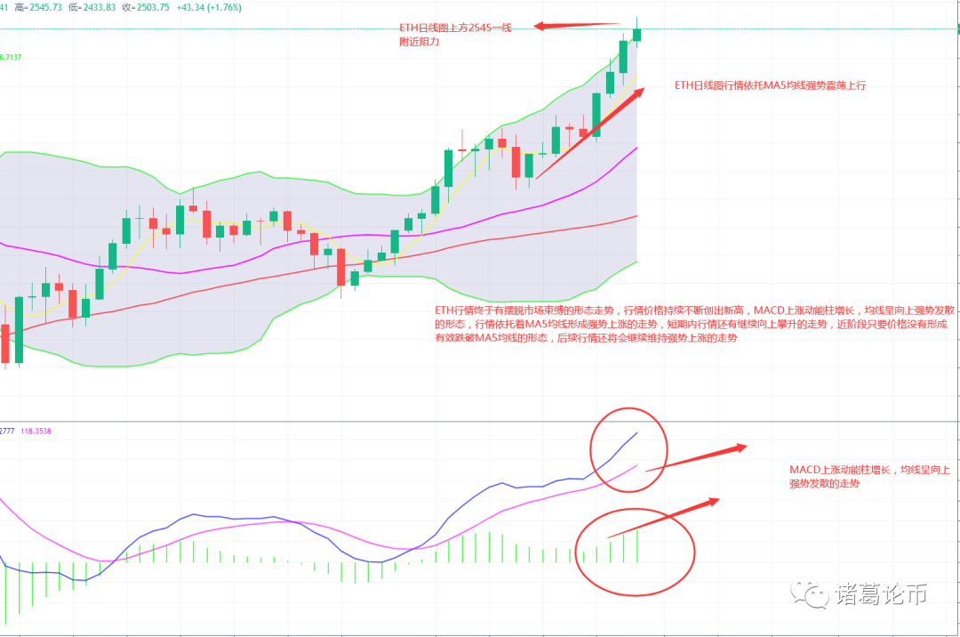 ETH再度创出新高行情价格早间强势上涨至2545一线小幅承压调整,技术形态MACD上涨动能柱增长,均线呈向上强势发散的形态,整体形态行情价格依托着日线M5均线震荡强势上升,虽然行情暂时小幅承压调整,但只要价格没有有效的跌破日线MA5均线的支撑,行情调整后还将会继续维持震荡强势上涨的走势,所以日内需关注行情回落调整时介入抄底的时机出现。