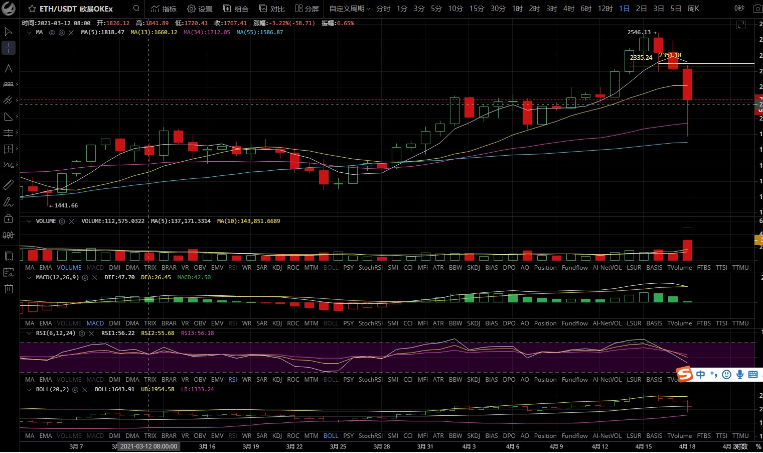 BTC结论:今天币价大跌,总体账户亏损3%左右,主要得益于一单抄底单(次季合约负溢价严重,买入大舱位开多,60%盈利止盈)原因分析:为啥没有做空套保,并且还拿着一小部分的合约多单,还是因为对行情不够敏锐、开单不果敢,同时今天币价的下跌幅度也是意料之外的。没有巨幅亏损的原因分析:①得益于将所有的账户资金归拢到BTC和ETH,显示了抗跌性,其他的币种已经跌妈不认了。且聚焦之后,就方便操作合约了。②三个账户虽然都有资金,但是依然还是很难同时操作,这方面后续要加强锻炼。③低倍杠杆操作。如果不是低杠杆操作,今天不止损失这么写,可能更大,如果不是低倍杠杆操作,可能爆仓了,想想今天爆仓达到60亿美元,是有点后怕的。