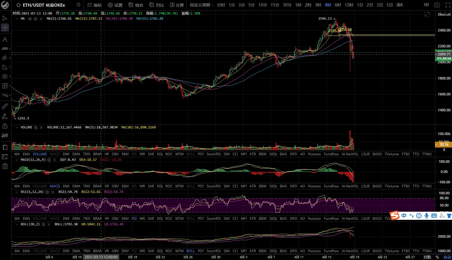 BTC 4小时:当下币价正走一个弱势的震荡回调,今天早上出现巨幅的下跌,次季合约最大跌幅达到-25%。均线即将形成完全的空头排列,34日线即将下叉55日线,看空。MACD开始零下收敛运行,RSI为31但是略微拐头向上,走得很弱势,看成偏弱势的震荡回调。