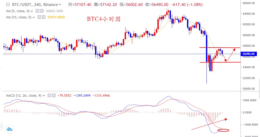 所以这两天的波动比较剧烈,主要受制于政策的影响,比特币之前的上涨也是市场放出的一种错误信号,然后不断有人在高位接盘,虽然政策在调整,比特币的价格下跌没有呈现极度下跌,还在大家可以承受的范围之内,也给市场留有一定的余地,并没有说不准持有数字货币资产,所有的政策实施基于金融市场的稳定,不过最近比特币的波动也的确大了些,交易上存在巨大的风险,所以不管什么时候,大家操作的时候一定要带好止盈止损,我们把握住我们应得的利润就行,也不要去后悔少赚了或者扫损了后行情又出现止盈这种情况,市场往往都这样,我们做好自己的风控就行,比特币从日线上分析,昨天直接一根阳柱下穿了布林带中轨,目前受到60日均线在55000这个位置的支撑,倘若该位置进行突破,那么行情势必会进一步下行,上方我们需要关注的阻力位在59000这个位置,也就是说近期大家在大方向上把握住这两个点就行,短线上看,行情还有继续回落的空间,晚间走势极有可能会继续下滑,小时线上重点关注下方55700这个位置的支撑,破位后行情会出现回落,不破位会有反弹,但是预计力度不会很大,总体上看晚间采取反弹做空的思路进行,下方不破5500会有反弹,不知道怎么操作的可以关注公众号唐思哲获取。