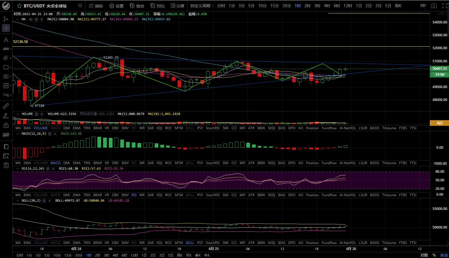 BTC1小时:当前币价正在上涨,形成1小时5连阳,短期开个多单。先看涨到51000水平,后续再说。均线系统排列紊乱,MACD零上扩散运行,RSI处于67位置且略微拐头向上,继续看涨。