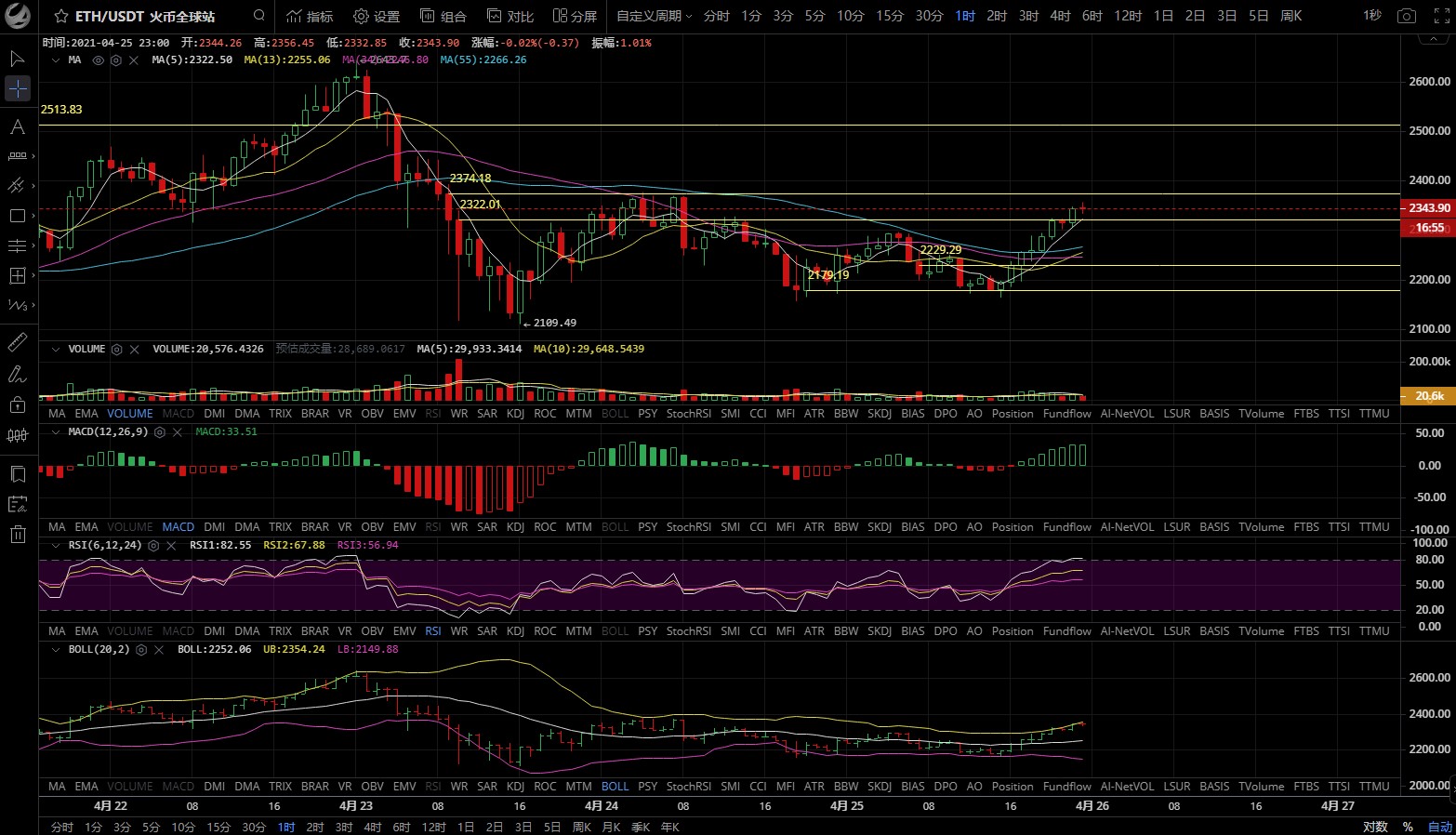 ETH 1小时:当前币价正在上涨,量能正常。均线系统偏空头排列,MACD零上扩散运行,RSI处于80位置且略微拐头向下运行,遇到压力位了,短线可能会回调一下,然后继续涨。