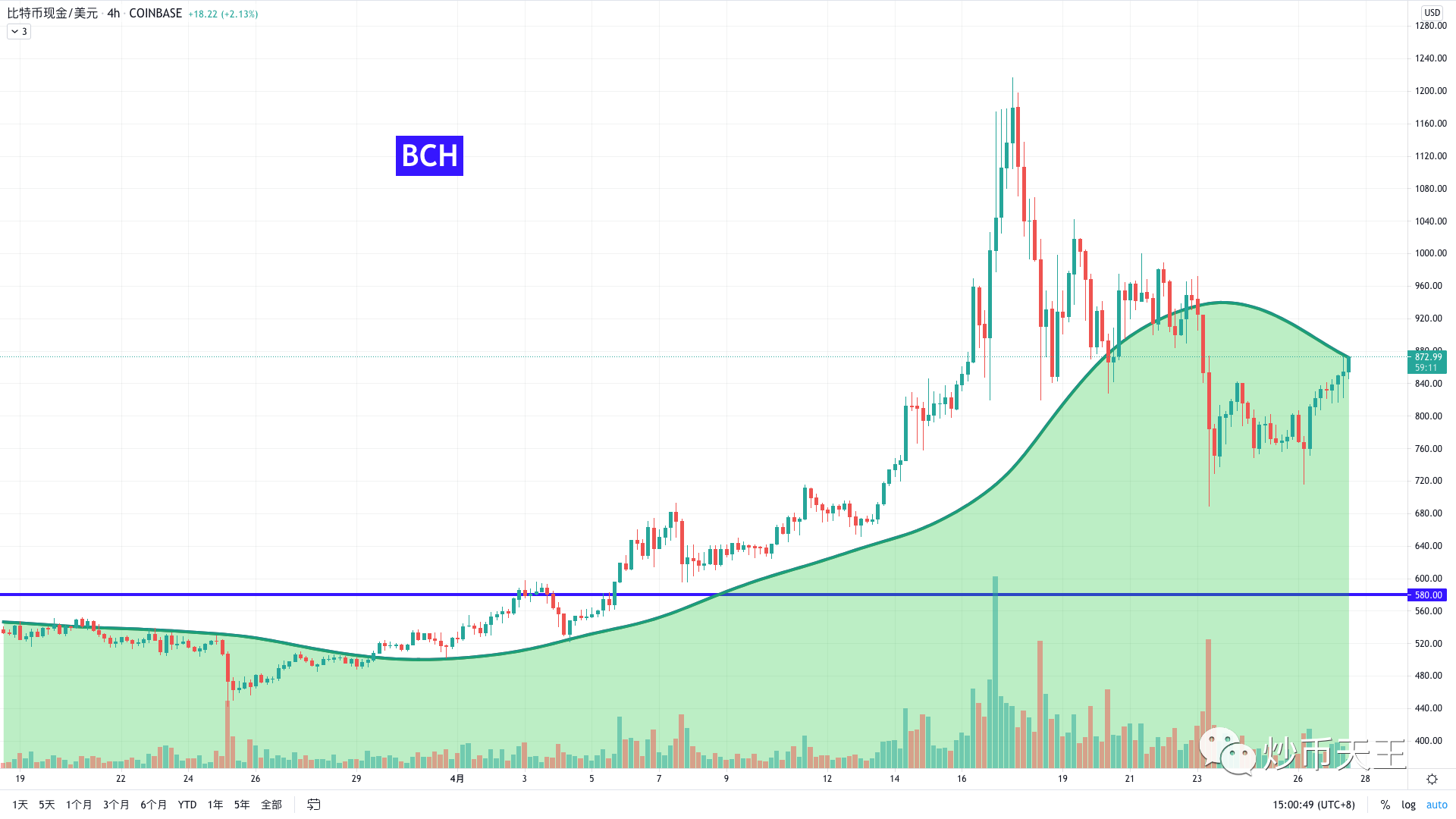BCH在经历了这轮大跌后终于也在昨天重振旗鼓,联动大盘开始上攻。技术面上看,目前四小时级别已经走出了八连阳的形态,但是目前币价受到十日线865一带的短期压制,正在盘整,伺机突破。值得注意的是,在上轮大跌中皇子和以太表现相对强势都没有跌破日线级别的MA30的生命线,所以还是很看好皇子后期持续发力续刷新高。
