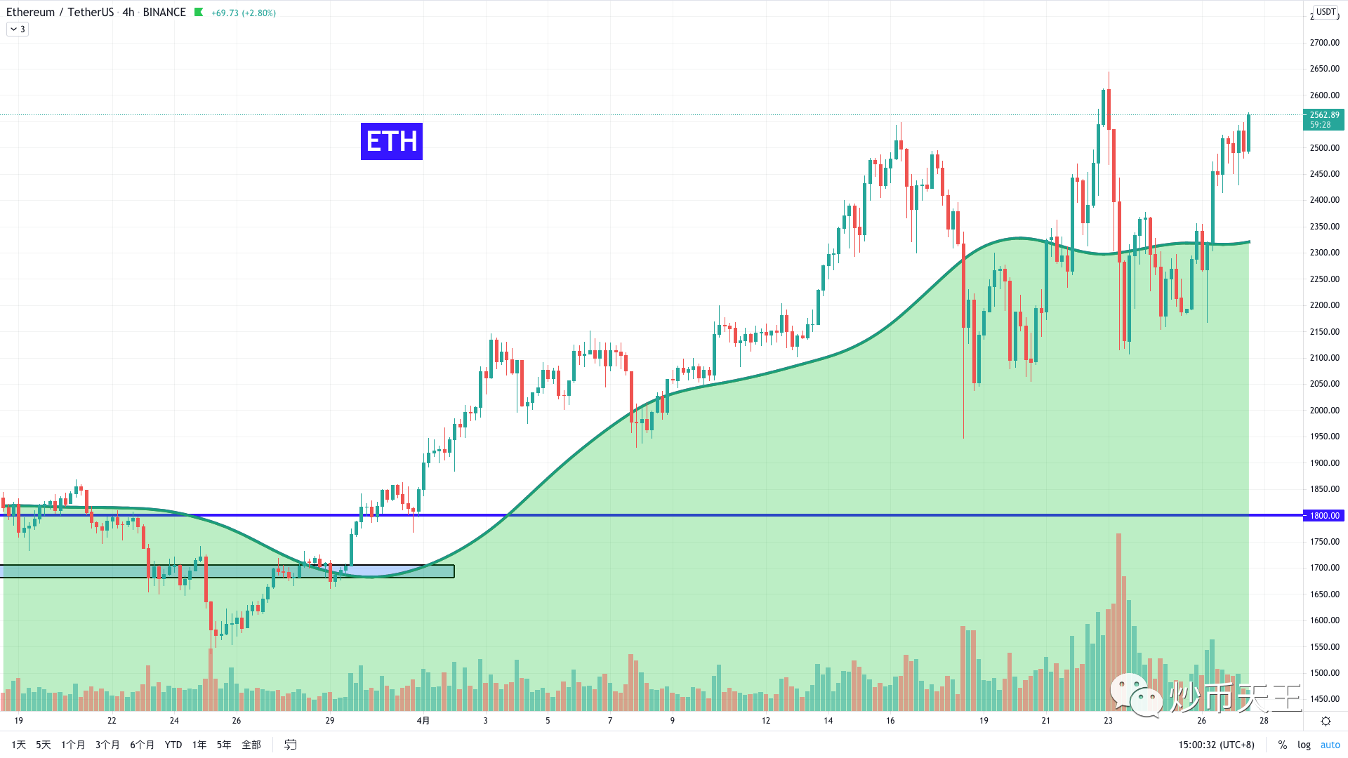 ETH的走势非常漂亮,多头的强势一览无余,验证了那句话:强者恒强。也如我们之前所分析的走势基本一致,率先走出盘整,向上突破,昨天也是联动大盘一起上攻。四小时级别来看走出了一个W底形态,颈线位置正是前高,下一轮冲破前高后将再次迎来一轮不小的爆发,剑指3000。日线级别几根常用均线全部向上发散,众星捧月在2400-2300区间形成较强支撑,短期内有望上攻3000大关。等待一个小回调即可以入场。
