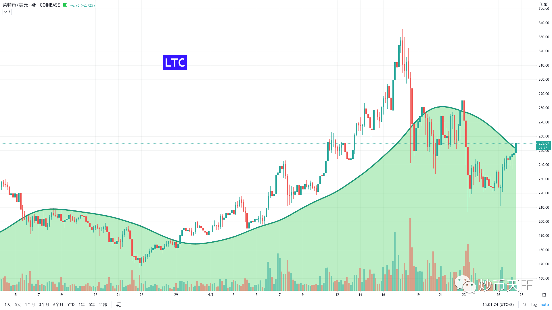 LTC也是紧跟大盘脚步,在昨天吹起了反攻的号角,在昨天冲破了240一带的压制后,简单盘整后继续发力,今天早间币价已经站上250大关,前文提到过短期内有机会站上日线MA30,目前来看两天的时间已经站上并企稳。下方240附近压力变支撑,回调至240附近可以考虑进场,短期目标280。