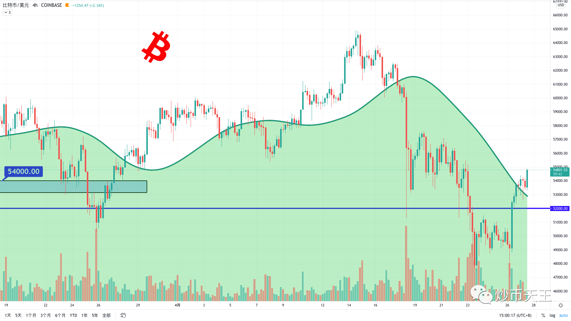 BTC昨日最大反弹幅度近7000点,日线也在一路小阴之后收了一根10%的大阳。早盘一度触及之前文章给的压制关口延续盘整,日线基本奠定反弹总体趋势,短线虽有54500一带承压但不改反攻总体趋势,上一篇提到过,这次的方向选择至关重要,无论是放量向上还是向下突破,现在来看全新一轮的多头趋势已经开启,回调即买点关注上方阻力支撑带;总之,方向已定,路再远都只是过程。
