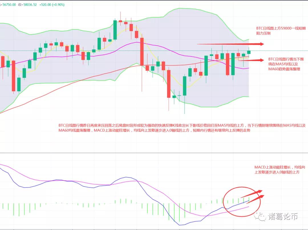 BTC行情昨日承压回落后在尾盘时段走出较为强劲的反弹,价格收盘时段回归至了MA5均线的上方,K线收出较长的下影线,这也显示出行情虽然弱势但下跌的动力却开始有所减弱,技术形态日线图MACD上涨动能柱增长,均线逐步进入0轴线的上方,当下行情依托着MA5均线震荡整理,短期内行情还有进一步向上反弹的走势,整理形态BTC上方59000是短期内较为关键的阻力压制,行情价格只有有效突破该位置才能够进一步的打开上升空间,但同时也需预防行情如果迟迟不能形成向上突破的走势话再度走出承压快速回落的走势。